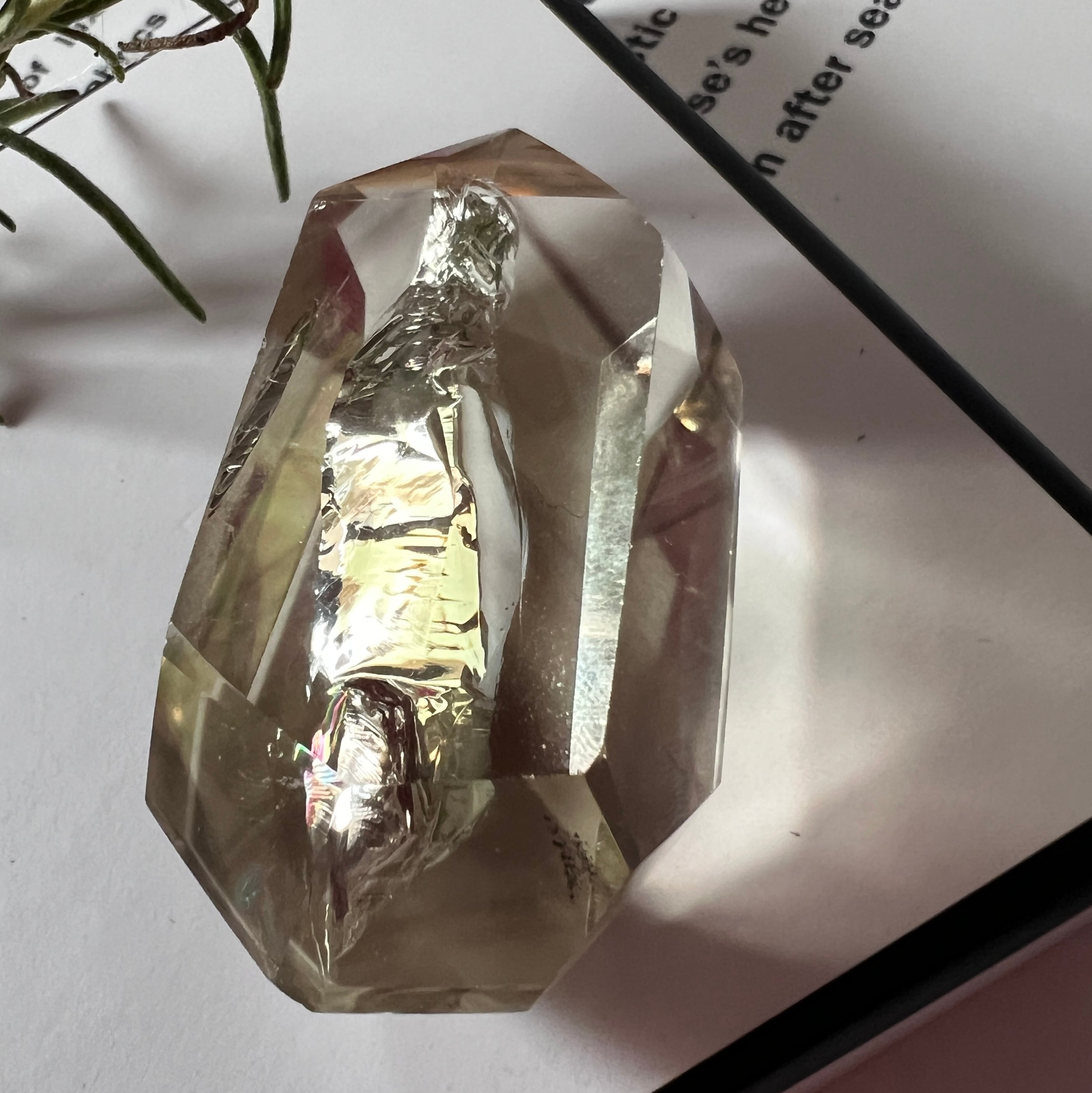 結晶内部には成長痕であるファントム(幻影)と、天然のクラックによって生まれる虹が現れ、角度によって輝きが変化します。
