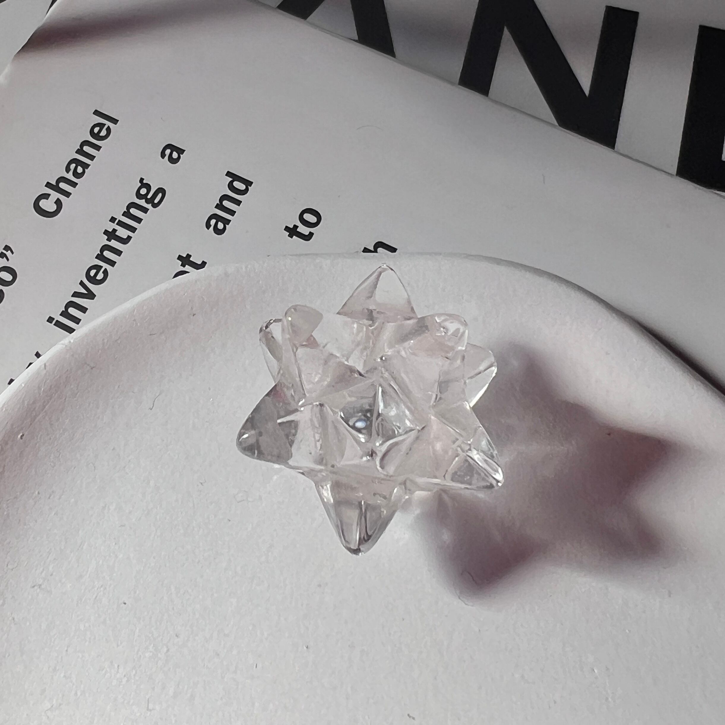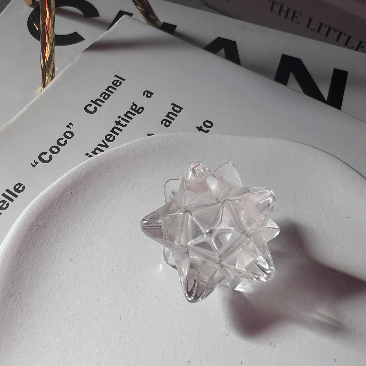 ブラジル・バイーア州アレグレ産の希少レムリアンシードクリスタルを、贅沢にアステロイド(小星型12面体)へと彫刻した特別仕様です。
