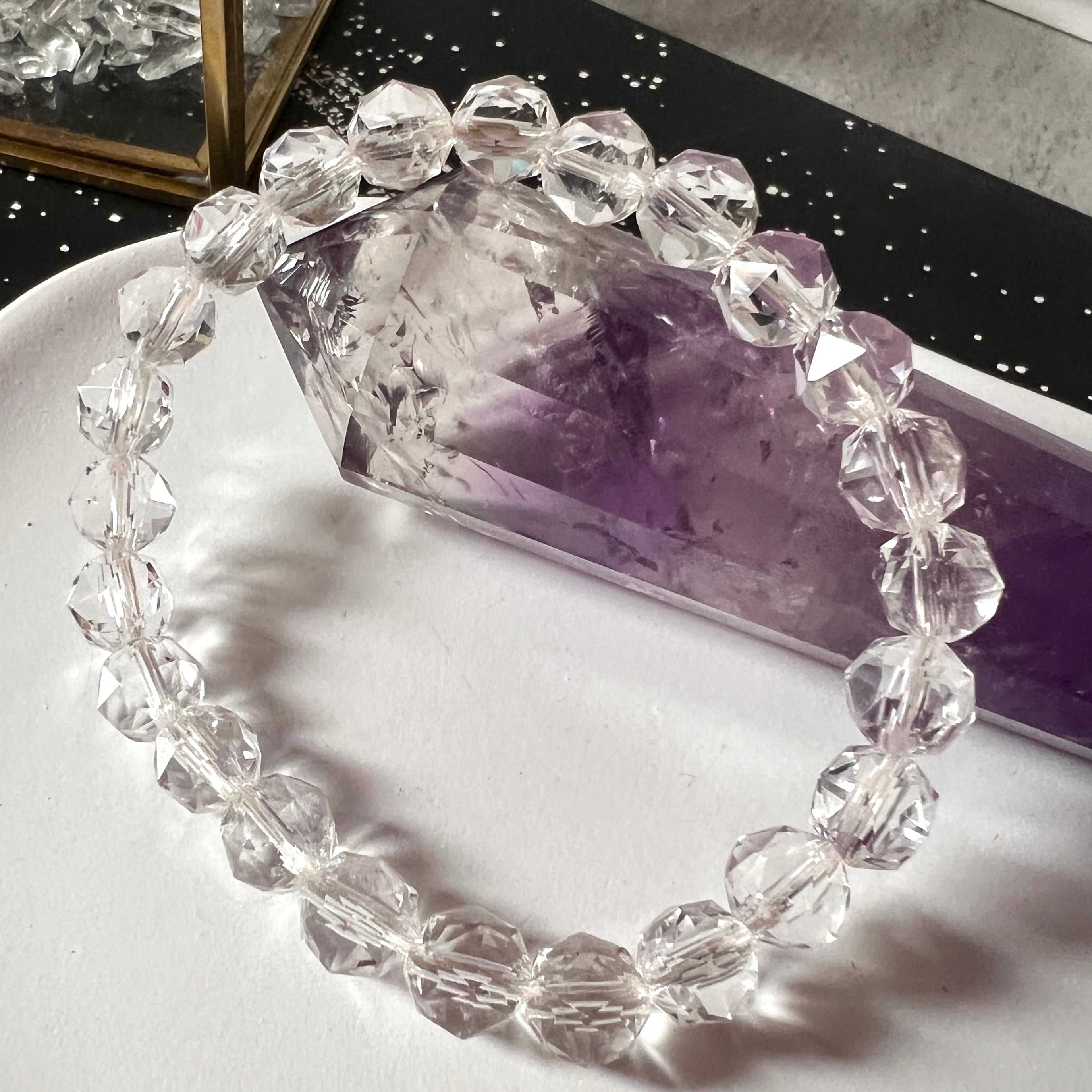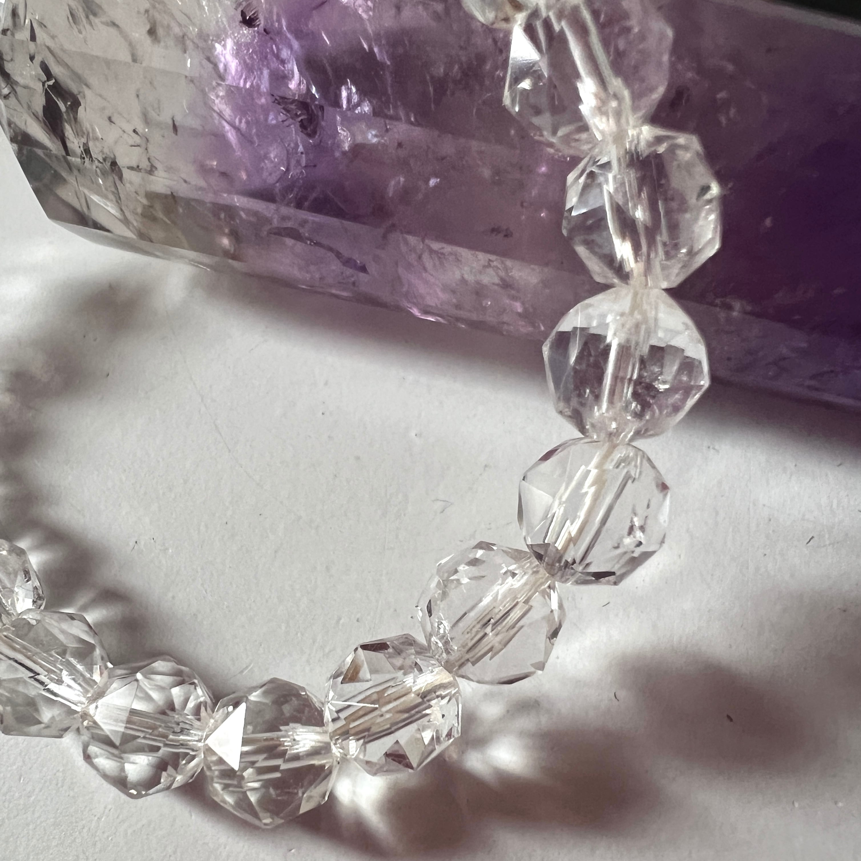 ブレスレットのように小さな石同士が集まるシーンでは、光の動きによって全体のバランスがとれやすくなり、重ね付けしている石たちの調和をサポートする役割もあり、波長が異なる石同士を自然にまとめ、持ち主が使いやすい状態に整えてくれるのが、多面カットの特徴です。